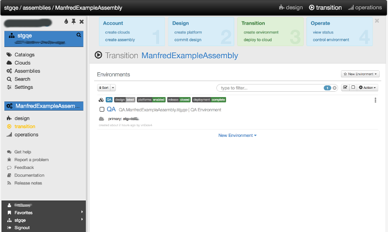 The phases wizard is displayed above the main content area and contains links to actions related to Account setup and the phases Design, Transition and Operate. The links are all context sensitive to the current organization and assembly. The current phase is highlighted in green. It can be disabled with the close button on the right.